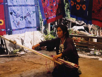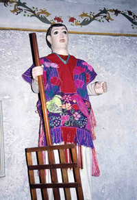 by Tribal leaders. Ancient methods of cooperative maize (corn) farming by men and women reaches into the steep slopes of the Highlands.  The wool of el borrego (the sheep) is woven into traditional clothing that provide warmth in the frigid altitude.  Community work incentive focuses upon human sustenance and is not economically driven.  The product is mainly for family use and weekly markets allow villagers to barter goods.  The living mythologies of the Tzotzil-Maya constantly reference the borrego and the maize that provide their community sustenance. In recent years, men have begun wearing blue jeans and American T-shirts although women and elders strictly adhere to traditional dress codes.  A long wool skirt with a colorfully embroidered shirt is worn by the woman.  The color and decoration of her shirt immediately tells other Tzotzils of her township, heritage, and marital status.  A tribal leader is identified by a wool serape and a hat with flowing ribbons that symbolize the extent of his power. |